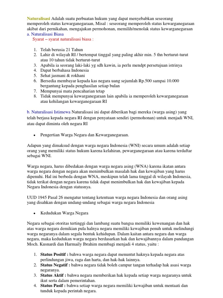Berdasarkan pasal 26 ayat 1 uud 1945 warga negara adalah orang orang bangsa indonesia asli dan orang orang bangsa lain yang disahkan dengan undang undang sebagai warga negara. Ini adalah kewajiban yang mengharuskan seseorang untuk melakukan atau tidak melakukan sesuatu. Mempunyai kedudukan yang sama pada setiap warga negara jawaban. Menurut koerniatmanto s pengertian warga negara adalah anggota dari negara yang mempunyai kedudukan khusus terhadap negaranya dan mempunyai hubungan hak dan kewajiban yang bersifat timbal balik terhadap negaranya.