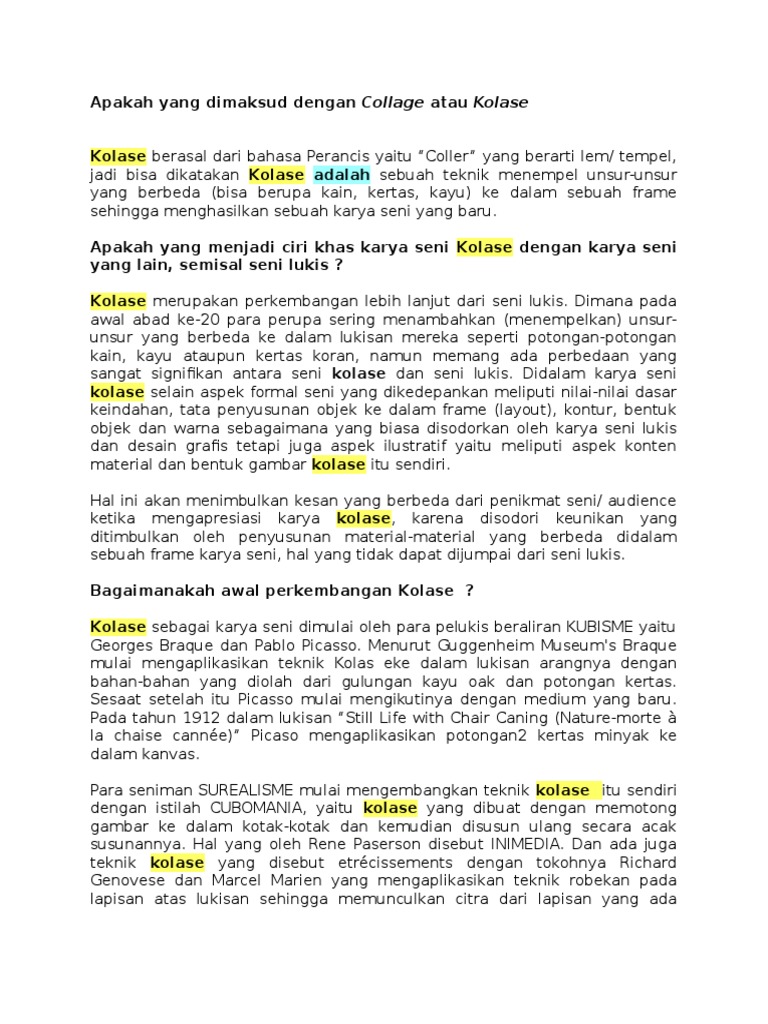 Kubus lingkaran dan sebagainya seniman kubisme sering menggunakan teknik kolase misalnya menempelkan potongan kertas surat kabar gambar gambar poster dan lain lain. Kolase ini dibuat menggunakan bahan bahan yang masih mentah yang sifatnya padat kering tetapi tidak keras sehingga mudah dalam menempelkannya seperti kain flanel kain perca dedaunan ranting pohon dan lain lain yang penting bahan bahan tersebut tidak. Disini yang menjadi ciri khas dari karya seni kolase adalah bahan yang digunakannya serta jenis karyanya yaitu bersifat non dekoratif. Dalam seni lukis kolase bentuk asli bermaterial yang di pakai harus terus tampak jadi jika memakai kerang kerangan atau potongan potongan photo benda sisa material itu mesti masih tetap bisa di kenali bentuk aslinya walaupun sudah di.