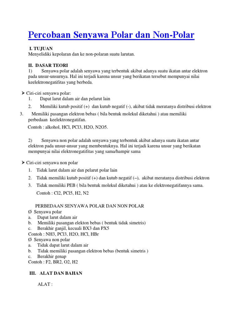 Pengertian senyawa polar dan non polar senyawa polar adalah senyawa yang terbentuk akibat adanya suatu ikatan antar elektron pada unsur unsurnya. Senyawa organik seperti karbohidrat lipid protein dan asam nukleat adalah contoh senyawa molekuler. Ikatan kovalen polar adalah ikatan yang pasangan elektron ikatannya cenderung tertarik ke salah satu atom yang berikatan. Ini adalah contoh ikatan kovalen dan senyawa kovalen.