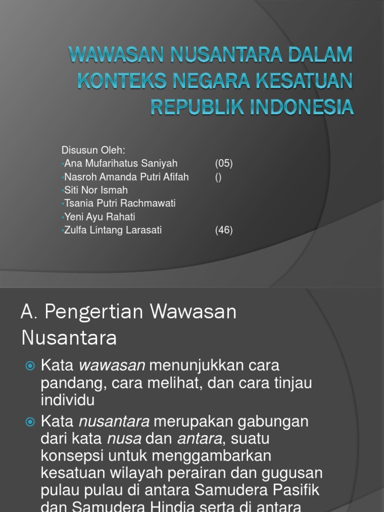 Pengertian dari wawasan nusantara ini ialah suatu cara pandang bagi bangsa indonesia mengenai diri serta juga lingkungannya itu sesuai dengan ide nasionalnya yakni pancasila serta uud 1945 ialah sebagai aspirasi suatu bangsa yang merdeka berdaulat serta bermartabat di tengah tengah lingkungannya yang menjiwai tindak kebijaksanaan di dalam mencapai tujuan perjuangan bangsa. Wawasan nusantara adalah cara pandang bangsa indonesia terhadap rakyat bangsa dan wilayah negara kesatuan republik indonesia yang meliputi darat laut dan udara di atasnya sebagai satu kesatuan politik ekonomi sosial budaya dan pertahanan keamanan. Keutuhan dan kelengkapan pelaksanaan wawasan nusantara yang terwujud dalam terselenggaranya kesatuan dan ketahanan nasional indonesia harus senantiasa ditingkatkan sesuai dengan kemajuan zaman. Hakikat wawasan nusantara adalah keutuhan nusantara dalam pengertian cara pandang yang selalu utuh menyerluruh dalam lingkup nusantara demi kepentingan nasional.
