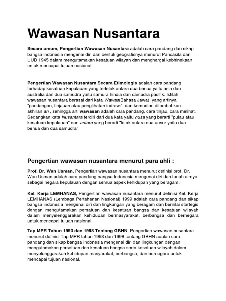 Apa yang dimaksud dengan wawasan nusantara menurut tap mpr dan gbhn. Menurut tap mpr tahun 1993 dan 1998 gbhn menurut tap mpr tahun 1993 dan 1998 apa yang dimaksud wawasan nusantara adalah suatu cara pandang dan sikap bangsa indonesia tentang diri dan lingkungan dengan mengedepankan persatuan dan juga kesatuan bangsa wilayah dalam menjalankan kehidupan di masyarakat berbangsa bernegara demi mencapai suatu. Tujuan wawasan nusantara adalah menumbuhkan jiwa jiwa manusia indonesia yang cinta tanah air berjiwa nasionalis dan patriotic. Jika dijabarkan secara etimologis wawasan adalah suatu kata yang dasarnya berasal dari kata wawas awas yang artinya adalah pandangan tinjauan dan penglihatan. Jelaskan pengertian wawasan nusantara istilah wawasan nusantara didapat dari penggabungan dua kata yang berbeda makna yaitu wawasan dan nusantara.