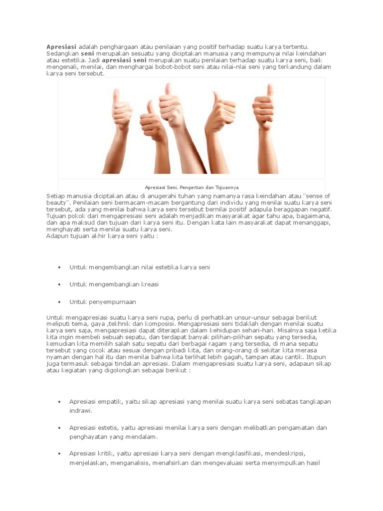 Apresiasi seni merupakan suatu penilaian terhadap suatu karya seni. Apresiasi seni merupakan suatu proses penghayatan suatu karya seni yang dihormati serta penghargaan pada karya seni tersebut dan pembuatnya. Sehingga dapat kita simpulkan bersama bahwa apresiasi seni adalah suatu kegiatan penilaian terhadap karya seni. Secara etimologi kata apresiasi berasal dari bahasa latin yaitu apreciatio yang artinya menghargai. Pengertian jenis fungsi dan cirinya.