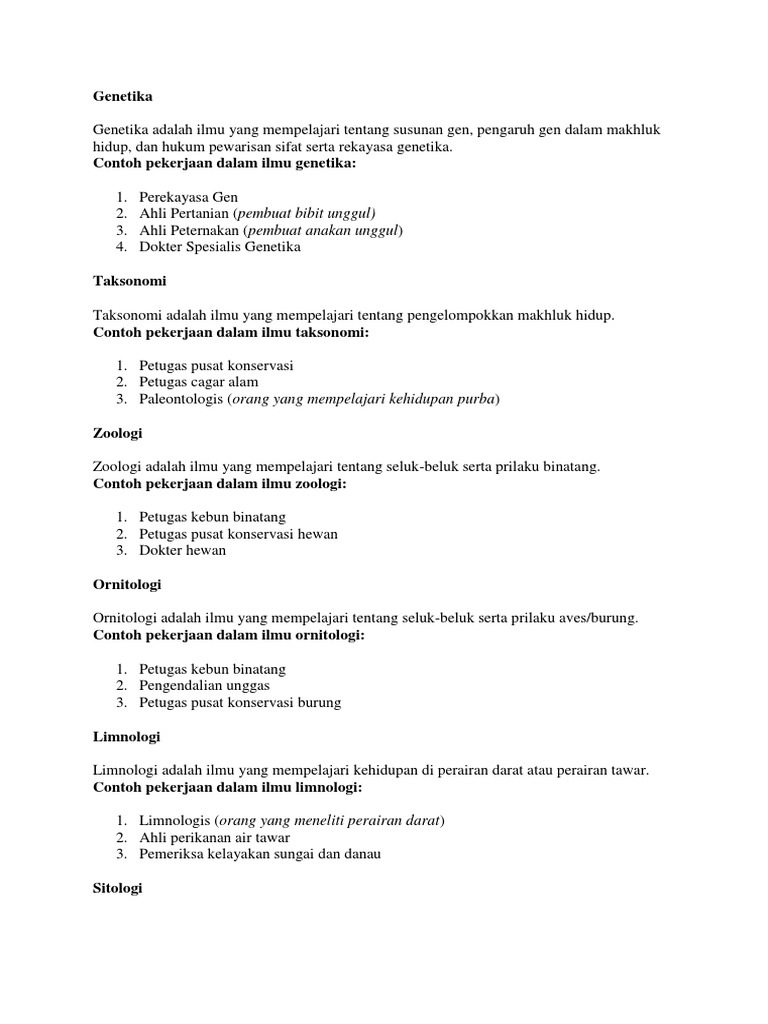 Seorang ilmuwan yang bernama gregor johan mendel merupakan orang yang pertama kali melakukan penelitian mengenai penurunan sifat oleh karena itu ia dinobatkan sebagai bapak genetika. Genetika adalah ilmu yang berhubungan dengan studi dan pemahaman tentang faktor keturunan evolusi perkembangan ekologi biologi molekuler dan ilmu forensin. Taksonomi adalah ilmu yang mempelajari prinsip dan cara klasifikasi makhluk hidup. Sehingga akan membuat ilmu biologi selalu berkembang dan berkembang seiring perkembangan zaman.