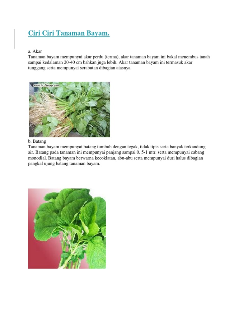 Batang berwarna merah tua bentuk bulat langsing dan halus daunnya berwarna hijau dengan belang merah tua di tongahnya. Ciri ciri bebek jenis ayam yang sering kita temukan di indonesia ayam cemani kokok balenggek sayur pelung bekisar ketawa dan masih banyak lagi jenis ayam yang dapat kita temukan di negara tercinta ini. Ciri ciri tanaman bayam selanjutnya adalah daunnya tanaman bayam memiliki daun berbentuk bulat memanjang dengan warna hijau dan hijau tua. Tanaman bayam memiliki ciri ciri yang sangat mudah dikenali salah satunya daunya yang berwarna.