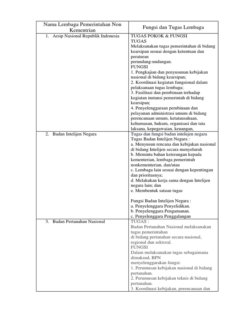 31 nama lembaga pemerintah non kementerian serta tugas dan fungsinya lembaga pemerintah non kementerian lpnk adalah lembaga negara di indonesia yang dibentuk untuk melaksanakan tugas pemerintahanan tertentu dari presiden. Sebagai lembaga pengawasan internal pemerintah bpkp sudah semestinyaada dan berwenang memiliki hak melakukan pengendalian atau pengawasanterhadap pengelolaan apbn mikro teknis terhadap seluruh lembaga negara dan lembaga pemerintah yang seluruh anggarannya dikelola dengan mekanismeapbn. Pengoordinasian instansi pemerintah terkait maupun komponen masarakat dalam pelaksanaan rehabilitasi dan penyatuan kembali ke dalam masyarakat serta perawatan lanjutan bagi penyalahguna dan atau pecandu narkotika dan psikotropika serta bahan adiktif lainnya kecuali bahan adiktif untuk tembakau dan alkohol di tingkat pusat dan daerah. Untuk membantu kalian dalam identifikasi tugas dan fungsi dari lembaga lembaga pemerintahan non kementerian aku sudah membuatnya dalam tabel seperti gambar di bawah ini.