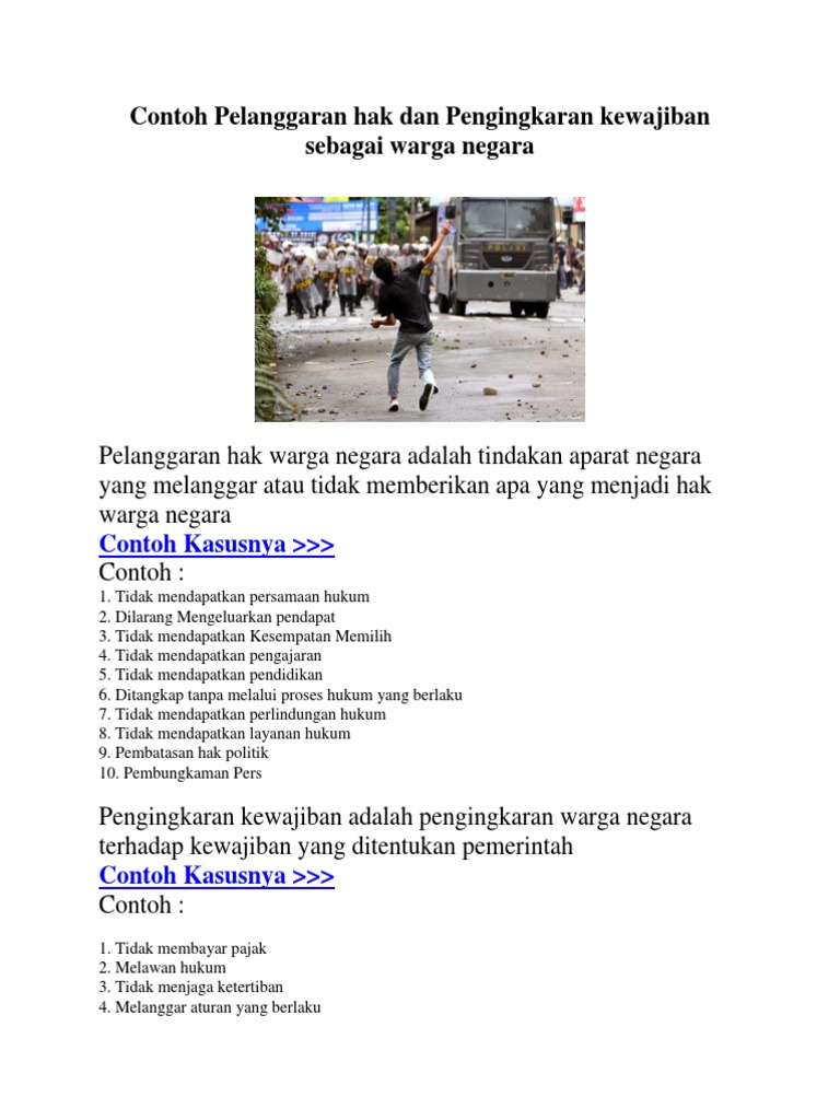 Contoh pengingkaran kewajiban sebagai warga negara adalah tidak membayar pajak. Penangkapan dan penahanan masyarakat sipil oleh aparat jawaban. Pengingkaran kewajiban warga negara merupakan suatu pelanggaran yang dilakukan warga negara terhadap kewajiban kewajibannya. Pengingkaran pada pajak hampir dilakukan oleh seluruh warga negara mulai dari pajak kendaraan pajak bumi dan bangunan pajak penghasilan pajak penjualan. Adapun beberapa contoh tersebut bakal dibahas lebih lanjut di artikel ini beserta dengan penyebab serta solusinya.
