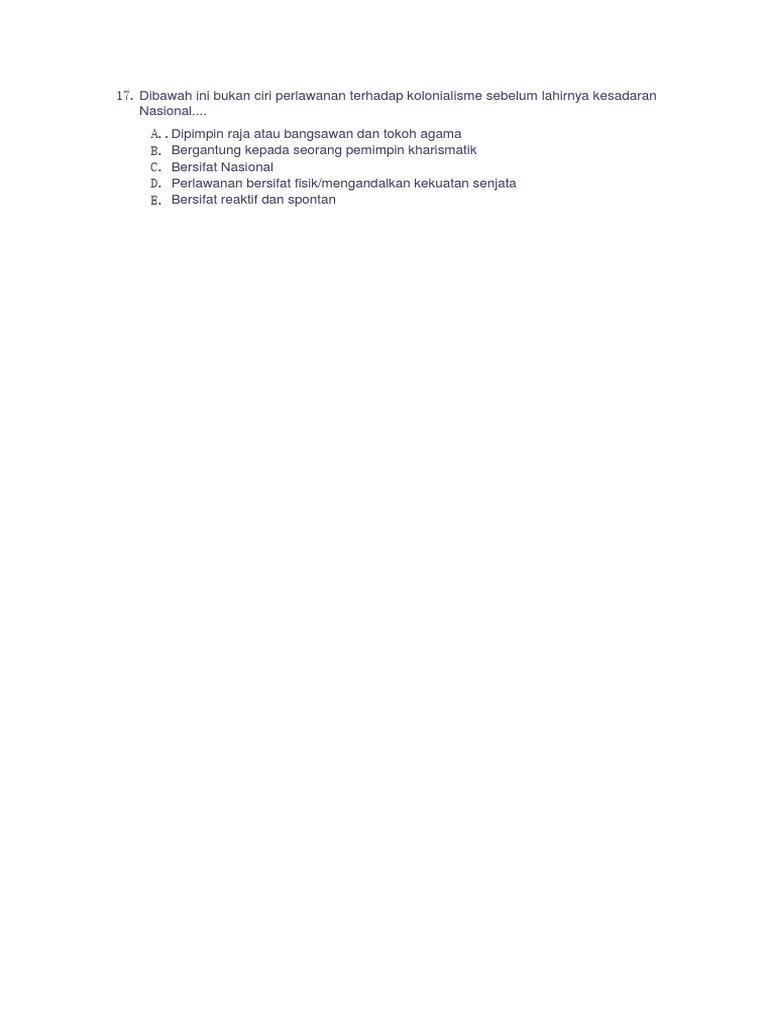 Dibawah ini bukan ciri perlawanan terhadap kolonialisme sebelum lahirnya kesadaran nasionalisme. Dipimpin raja atau bangsawan dan tokoh agama. Perlawanan yang dilakukan bangsa indonesia tersebut di bagi ke dalam dua periode yaitu perlawanan sebelum tahun 1800 dan perlawanan sesudah tahun 1800. Bergantung kepada seorang pemimpin kharismatik. Perlawanan bersifat fisik mengandalkan kekuatan senjata.