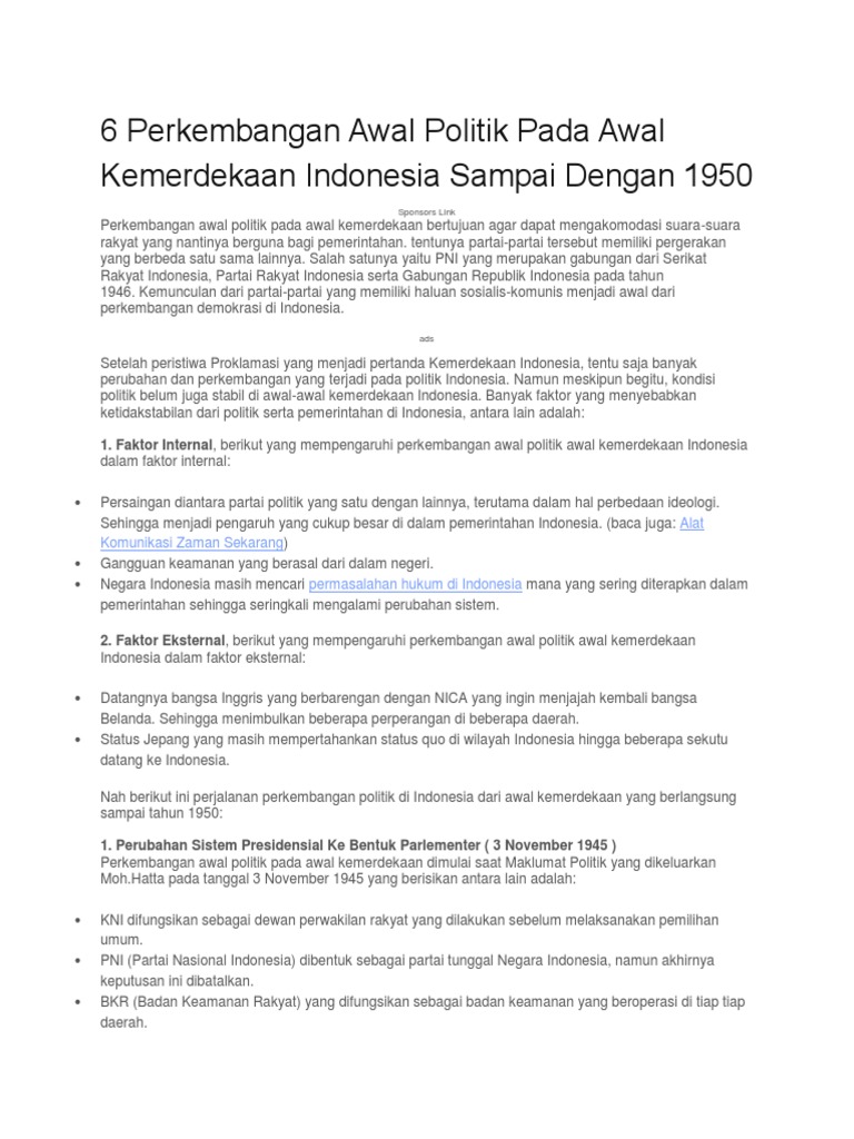Faktor eksternal ketidakstabilan politik dan negara pada awal kemerdekaan adalah. Indonesia yang baru saja merdeka belum memiliki pemerintahan yang baik dimana belum. Saat itu indonesia tidak memikirkan harga karena yang penting adalah dukungan dari negara lain yang sangat diperlukan dalam. Demokrasi liberal yang sekarang ini dapat kita lihat dari contoh negara yang masih menerapkan asas demokrasi liberal dalam sistem politiknya seperti amerika serikat menjadi salah satu sejarah kelam politik indonesia pada saat ini. Faktor faktor penyebab kacaunya perekonomian indonesia 1945 1950 adalah sebagai berikut.