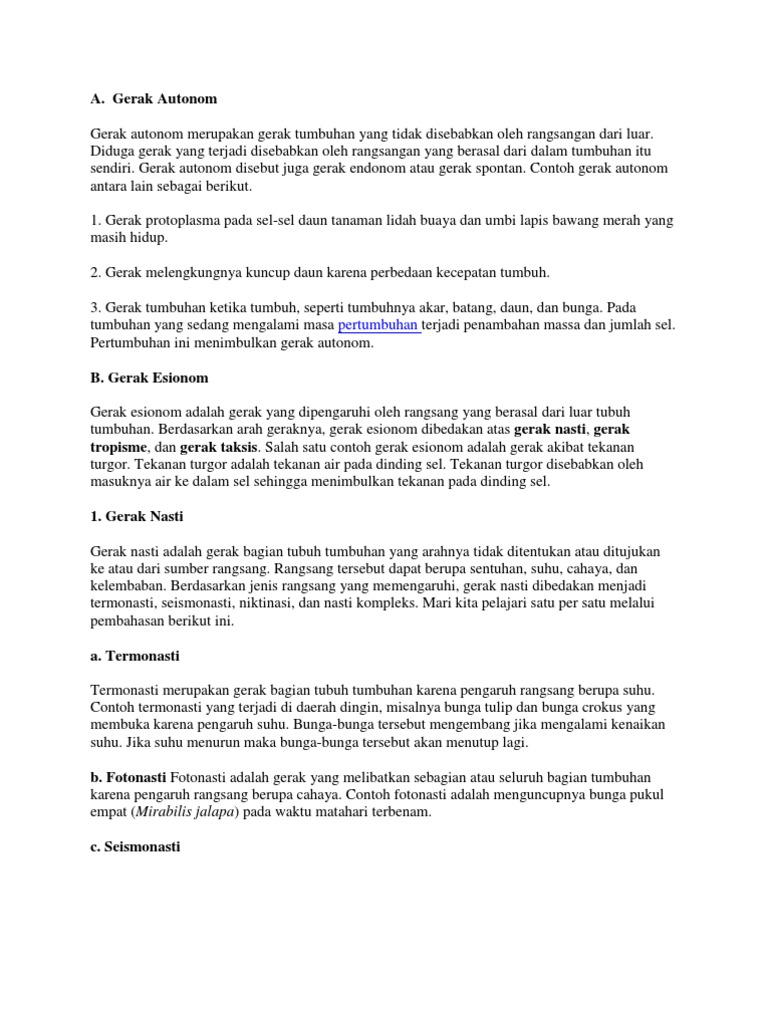 Gerak spontan pada tumbuhan yang tidak dipengaruhi arah datangnya rangsang disebut gerak. Gerak endonom adalah gerak pada tumbuhan yang tidak dipengaruhi rangsang atau tidak dipengaruhi faktor dari luar. Gerak tanaman berdasarkan arah stimulus. Gerak endonom ada 2 yaitu. Berdasarkan jenis rangsangannya nasti dibedakan menjadi beberapa macam yakni.