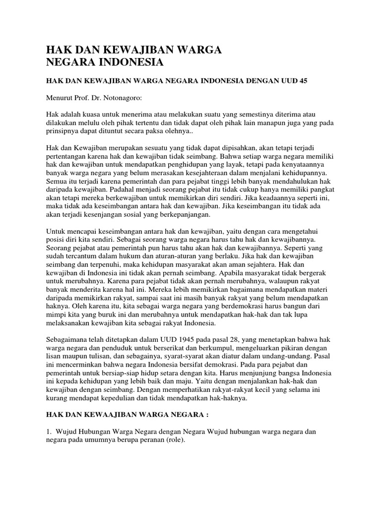 Terdapat hak hak warga negara yang ditetapkan dalam undang undang begitu pula dengan kewajibannya. Kewajiban warga negara dalam undang undang dasar 1945. Hak dan kewajiban warga negara tiap negara memiliki aturan terkait status kewarganegaraan yang berbeda beda termasuk juga di indonesia syarat kewarganegaraan ini diatur dalam uud 1945. Berdasarkan pasal 26 ayat 1 uud 1945 warga negara adalah orang orang bangsa indonesia asli dan orang orang bangsa lain yang disahkan dengan undang undang sebagai warga negara.