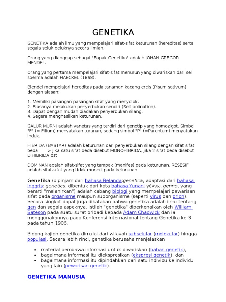Genetika adalah cabang ilmu biologi yang akan mempelajari segala macam hal mengenai gen materi genetik dna dan rna dan pewarisan sifat dari induk kepada keturunannya dan persilangan gen. Pewarisan sifat atau hereditas merupakan penurunan sifat dari induk kepada keturunannya. Ilmu yang mempelajari cara pewarisan sifat dari induk kepada keturunanya disebut. Pewarisan sifat atau yang lebih dikenal dengan hereditas merupakan suatu pewarisan sifat dari induk kepada keturunannya.