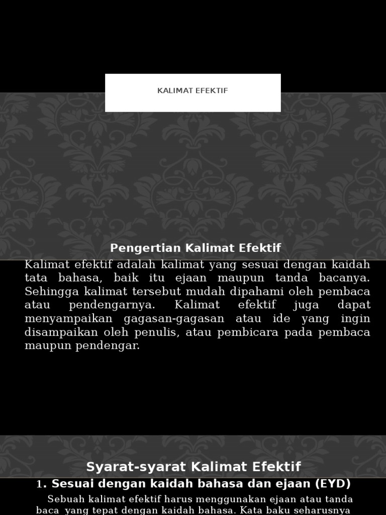 Kaidah yang menyertai ragam baku mantap tetapi tidak kaku cukup luwes sehingga memungkinkan perubahan yang bersistem dan teratur di berbagai bidang. Kalimat efektif adalah kalimat yang sesuai dengan kaidah bahasa baik ejaan maupun tanda bacanya sehingga mudah dipahami oleh pembaca atau pendengarnya. Ejaan yang sekarang dinamakan ejaan yang disempurnakan eyd eyd mulai diberlakukan pada tanggal 16 agustus 1972. Secara etimologis definisi ejaan ini lebih menekankan pada segi historisnya yakni dengan mempertahankan unsur yang tidak direalisasikan dalam sistem bunyi suatu.