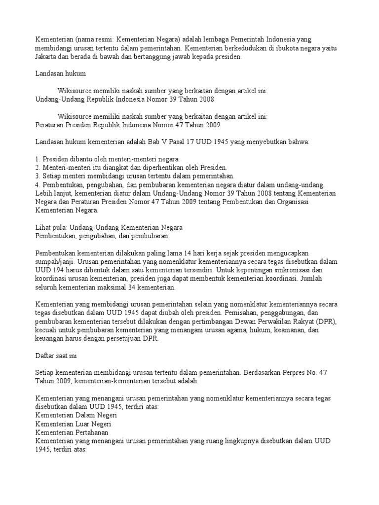 Kementerian pemuda dan olahraga. Kementerian koordinator terdiri atas beberapa kementerian sebagai berikut. Koordinasi dan sinkronisasi perumusan penetapan dan pelaksanaan kebijakan kementerian atau lembaga yang terkait dengan isu di bidangnya. Kementerian yang menangani urusan agama hukum keuangan dan keamanan memiliki unsur pelaksana tugas pokok di daerah.