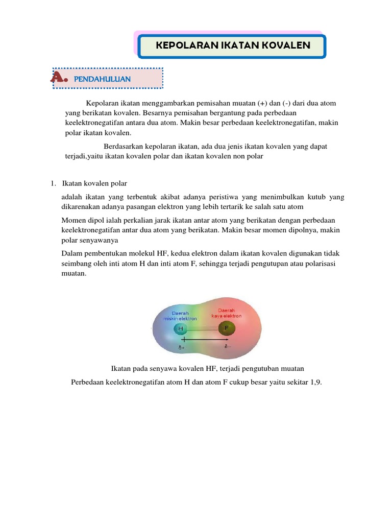 Ikatan kovalen polar adalah ikatan kovalen yang peinya cenderung tertarik ke salah satu atom yang berikatan. Oleh karena itu kita akan bahas lagi dengan lebih detail hingga semuanya. Kepolaran erat kaitannya dengan keelektronegatifan dan bentuk molekul.