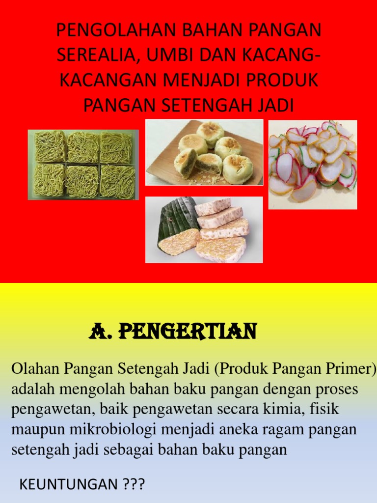 Keuntungan pengolahan setengah jadi. Dapat diperjualbelikan antar daerah dan sebagai komoditas ekspor. Bahan jadi adalah bahan yang siap dikonsumsi untuk memenuhi kebutuhan. Untuk mengolah bahan pangan segar menjadi bahan pangan setengah jadi diperlukan teknologi pengolahan dan alat pengolahan yang tepat. Keuntungan bahan pangan yang diolah menjadi bahan pangan setengah jadi adalah sebagai berikut.