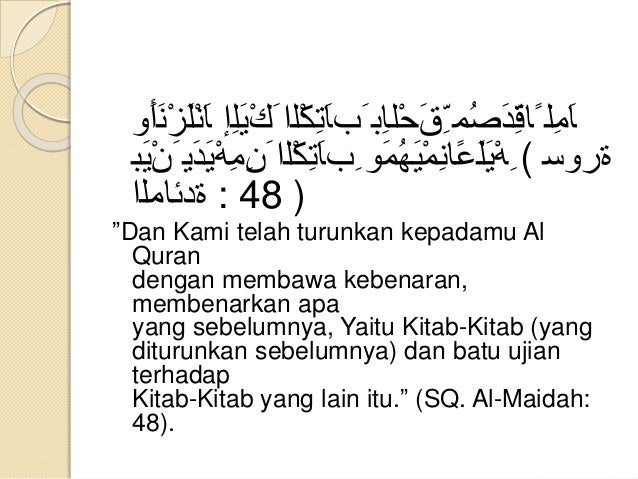 Kitab suci al qur an diturunkan allah swt. Selanjutnya tinggal mengamalkan dari apa apa saja yang telah dipelajari dari kitab suci al qur an tersebut. Al qur an sebagai final revelation ditujukan kepada seluruh umat manusia dibawa oleh nabi muhammad saw berisi seluruh rangkuman dan membenarkan kitab kitab sebelumnya petunjuk jalan pembeda antara yang bathil dan yang hak sebagai penerang dikarenakan berisi segala sesuatu yang diperlukan oleh manusia. Makaputuskanlah perkara mereka menurut apa yang allah turunkan dan janganlah kamu mengikuti hawa nafsu mereka dengan meninggalkan kebenaran yang telah datang kepadamu.