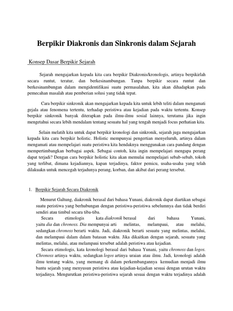 Sejarah bersifat diakronik berarti memanjang dalam waktu tetapi terbatas dalam ruang sejarah akan membicarakan satu peristiwa tertentu dengan tempat tertentu dari waktu a sampai waktu b. Kajian sejarah secara sinkronik artinya mempelajari peristiwa sejarah dengan segala aspeknya pada masa atau waktu tertentu dengan lebih mendalam. Pendekatan sinkronis menganalisa sesuatu tertentu pada saat tertentu titik tetap pada waktunya. P engertian diakronis sinkronis dan kronologi.