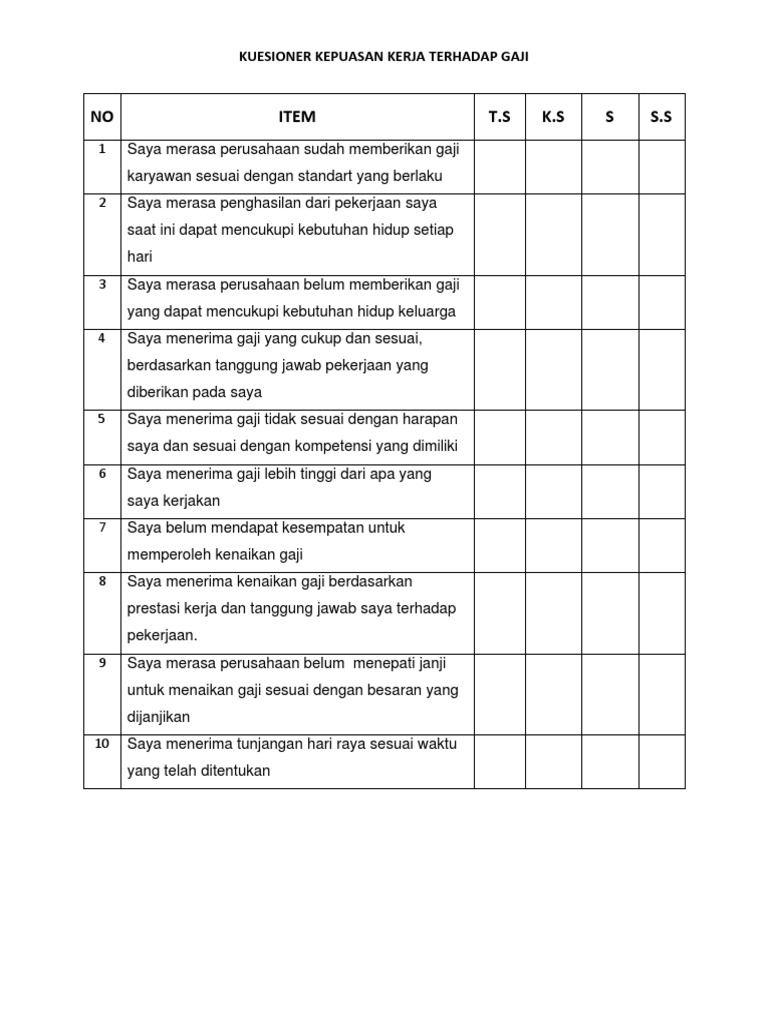Kuesioner kepuasan kerja. Bapak ibu sdr i responden bersama ini saya mohon kesediaan bapak ibu saudara i untuk mengisi kuesioner dalam rangka penelitian saya yang berjudul. Menurut robins kepuasan kerja atau job satisfaction diidentikkan dengan hal hal yang bersifat individual. Kuesioner kuisioner penelitian responden yang terhormat. Bapak ibu saudara karyawan dan karyawati di harum swalayan.