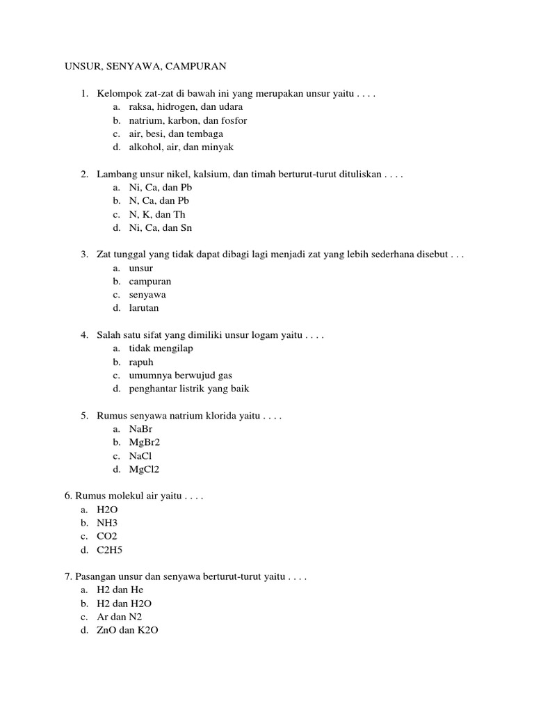 Saol latihan unsur senyawa dan campuran kelas 7 ini terdiri dari 2 bagian bagian pertama adalah soal latihan dengan jawaban pilihan ganda dan baian kedua soal latihan esay.