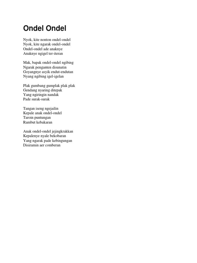 Em d ondel ondel ada anaknyanye boyyy d g anaknya ngider der ideran oyyyy g d mak bapak ondel ondel ngibing ser. Nyok kite nonton ondel ondel nyok kite ngarak ondel ondel ondel ondel ade anaknye anaknye ngigel ter iteran. Lirik lagu daerah betawi ondel ondel nyok kite nonton ondel ondel nyok kite ngarak ondel ondel ondel ondel ade anaknye anaknye ngigel ter iteran mak bapak ondel ondel ngibing ngarak penganten disunatin goyangnye asyik endut endutan nyang ngibing igel igelan plak gumbang gumplak plak plak gendang nyaring ditepak yang ngiringin nandak. Ondel ondel lagu daerah dki jakarta betawi budaya indonesia dongeng kita cipt.
