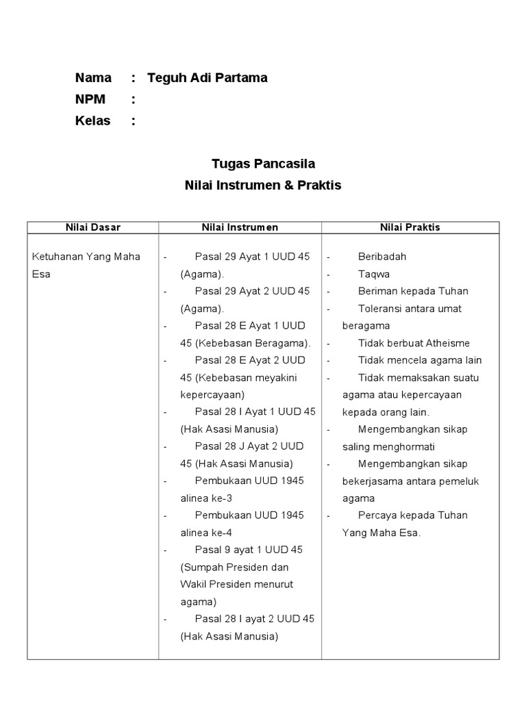 Pancasila ke 1 adalah ketuhanan yang maha esa dimana terkandung suatu nilai religius sebagai berikut. Nilai persatuan indonesia mengandung makna usaha kearah bersatu dalam kebulatan rakyat untuk membina rasa nasionalisme dalam negara kesatuan republik indonesia. Nilai praktis dari pancasila selalu berubah ubah seiring dengan perkembangan zaman dan juga perkembangan dari nilai nilai instrumental yang menjadi dasarnya. Pasal 28e 1 setiap orang bebas memeluk agama dan beribadat menurut agamanya memilih pendidikan dan pengajaran memilih pekerjaan memilih kewarganegaraan memilih tempat tinggal di wilayah negara dan meninggalkannya serta berhak kembali.