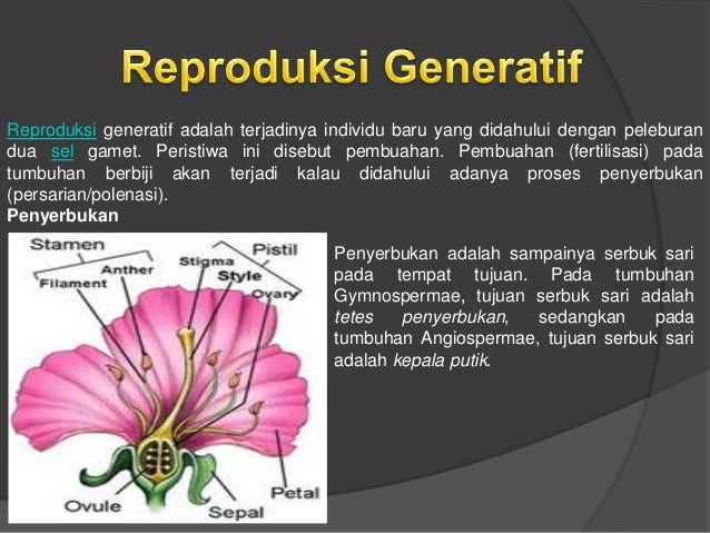 Pada tumbuhan biji pembuahan didahului oleh penyerbukan yaitu a adanya. Biji dihasilkan oleh alat perkembangbiakan yang disebut bunga. Perantara penyerbukan pada tumbuhan biji proses pembiakan generatif pada tumbuhan biji tertutup didahului oleh proses penyerbukan dan dilanjutkan dengan pembuahan. Penyerbukan adalah peristiwa menempelnya serbuk sari di kepala putik. Dua macam proses pembuahan yang terjadi pada tumbuhan.