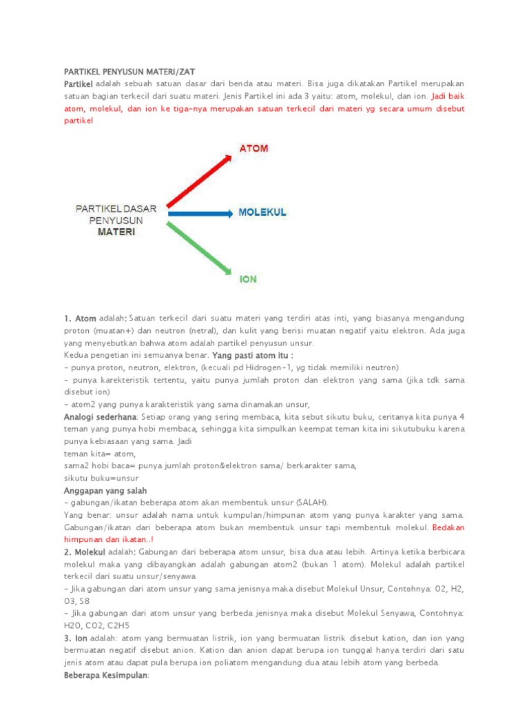 Jadi baik atom molekul dan ion ke tiga nya merupakan satuan terkecil dari materi yg secara umum disebut partikel 1. Pengertian atom yang pertama tercatat dari yunani oleh leucippus dan democritus pada awal tahun 500 sm 400 sm bahwa setiap materi dapat dibagi menjadi bagian yang lebih kecil hingga diperoleh bagian terkecil yang tidak dapat dibagi lagi yang disebut atomos atom dan atom adalah penyusun terkecil dari segala materi yang ada. Semua benda terdiri atas zat atau materi. Ion adalah atom yang bermuatan listrik.