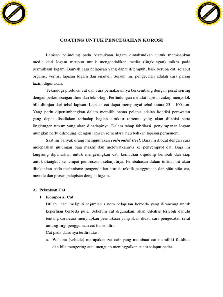 Korosi dan cara pencegahankorosi atau perkaratan sangat lazim terjadi pada besi. Korosi ini dapat juga diartikan sebagai suatu serangan yang merusak logam karena logam. Mencegah kontak dengan oksigen dan atau air. Contoh besi dilapisi perak platina timah atau nikel.