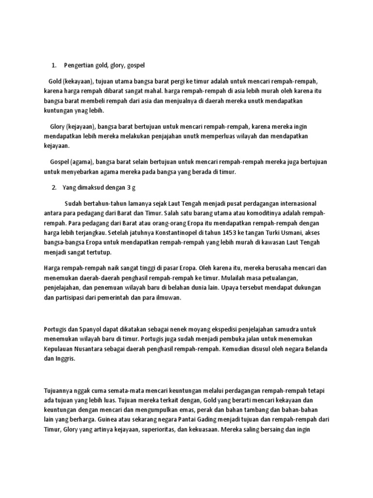 Pengertian gold glory dan gospel. Pada mulanya orang orang eropa ingin mencari dan bertemu prester john yang mereka yakini sebagai raja kristen yang berkuasa di timur. Oke semoga penjelasan singkat tentang pengertian 3g gold glory gospel ini bisa dimengerti. Apa yang dimaksud gold glory dan gospel. Hal tersebut menimbulkan keinginan untuk melakukan penjelajahan dunia yang dikenal dengan penjelajahan samudra yang bertujuan untuk mencari daerah penghasil rempah rempah namun ada hal pokok yang.
