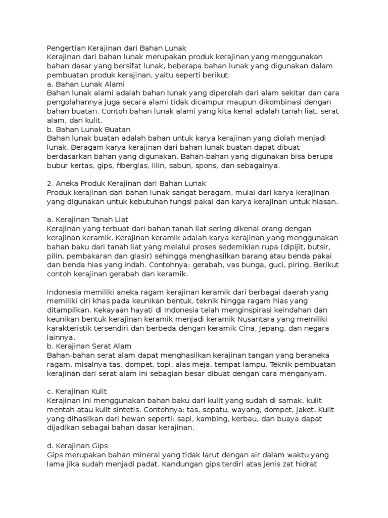 Pengertian kerajinan bahan lunak adalah kerajinan yang. Adalah jenis bahan yang dibuat untuk karya kerajinan yang diolah kembali menjadi bahan lunak. Sedangkan yang kedua adalah bahan keras buatan merupakan material kerajinan yang telah melalui proses tertentu seperti logam kaca plastik kain dll. Bahan lunak ini merupakan bahan alami yang dapat diperoleh dari alam. Pengertian kerajinan halo sobat pada kesempatan ini penulis kembali berbagi sebuah artikel mengenai tentang pengertian kajian dengan bahasan pengertian kerajinan fungsi kerajinan pengertian kerajinan menurut ahli jenis jenis kerajinan manfaat kerajinan bahan pembuat kerajinan beberapa contoh kerajinan dan tahapan pembuatan kerajinan.