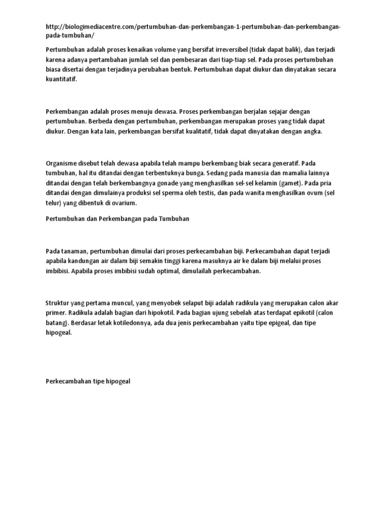 Pertumbuhan dan perkembangan berjalan melalui proses. Pertumbuhan dan perkembangan pada tumbuhan. Pertumbuhan terjadi karena pada pembelahan sel yang melalui mitosis dan meiosis. Proses pertumbuhan dan perkembangan pada manusia secara umum dapat dibedakan menjadi dua yaitu masa pembuahan sampai lahir masa dalam kandungan ibu dan masa setelah lahir. Misalnya pohon yang bertambah tinggi atau diameter batang pohon yang bertambah besar.