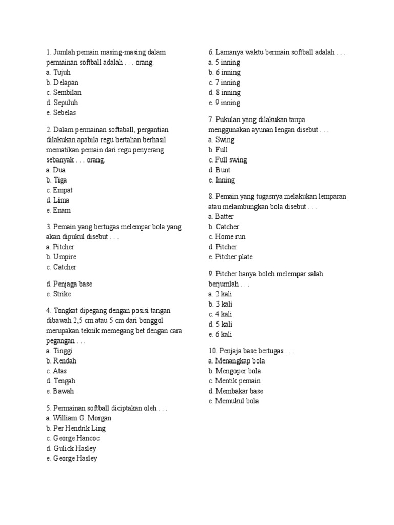Jumlah pemain jumlah pemain dalam setiap regu harus ada 12 orang di mana salah satu pemainnya harus ada yang bertugas sebagai kapten tim. Sofbol merupakan perkembangan dari olahraga sejenis yaitu bisbol baseball atau hardball bola sofbol saat ini berdiameter 28 30 5 sentimeter. Pitcher adalah pemain yang bertugas melempar bola kepada pemukul. Tiap base atau tiang hinggap hanya boleh untuk berdiri satu pemain saja.