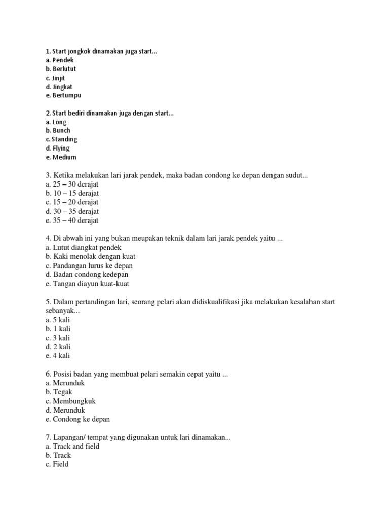 Kepala tetap tegak sewaktu berlari cepat. Track and field b. Lapangan tempat yang digunakan untuk lari dinamakan. Posisi badan yang membuat pelari semakin cepat yaitu.