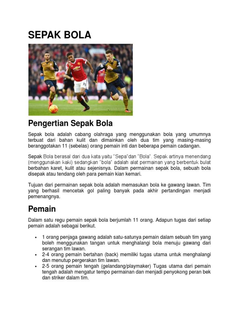Satu satunya pemain dalam sebuah tim yang boleh menggunakan tangan untuk menghalangi bola menuju gawang dari serangan tim lawan. Tim sepak bola terdiri dari 11 orang pemain utama. Tugas dari setiap pemain umunya adalah sebagai berikut. Satu satunya pemain dalam sebuah tim yang boleh menggunakan tangan untuk menghalangi bola menuju gawang dari serangan lawan. 2 4 orang pemain bertahan back memiliki tugas utama untuk menghalangi dan menutup pergerakan tim lawan.