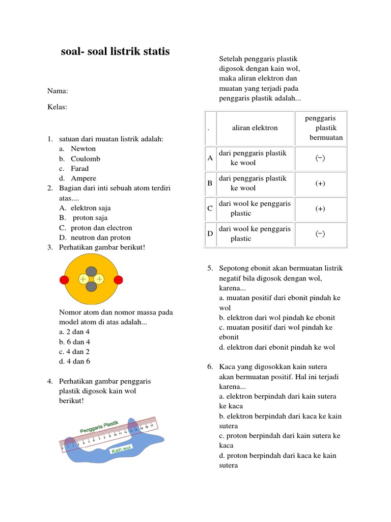 Sebuah ebonit digosok dengan kain wol akan menjadi bermuatan. Netral karena elektron pindah dari ebonit ke wol d. Ebonit akan kelebihan elektron sehingga ebonit bermuatan negatif. Positif karena proton pindah dari wol ke ebonit. Negatif karena elektron pindah dari wol ke ebonit.