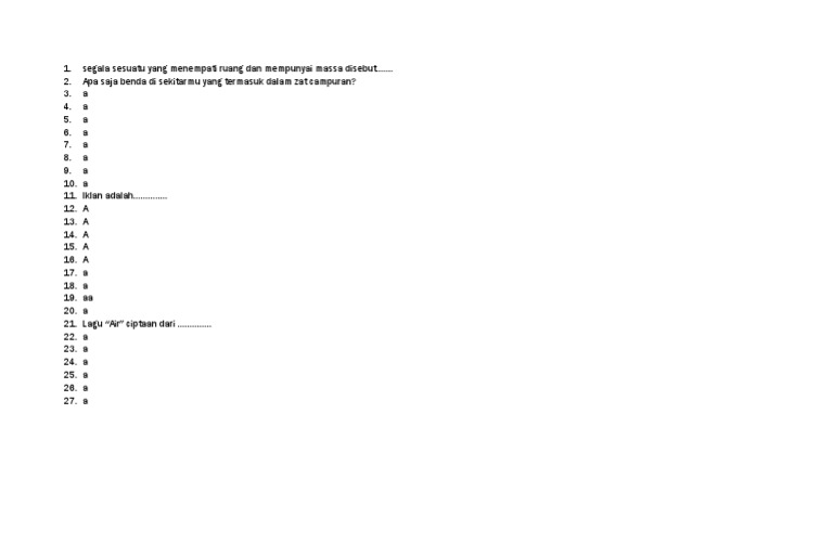 Segala sesuatu yang menempati ruang dan memiliki massa disebut sebagai. Unsur terdiri dari logam dan non logam. Sebuah contoh adalah air. Matter zat atau materi adalah sesuatu yang menempati ruang dan memiliki massa. Setiap benda baik berwujud padat cair maupun gas selalu memiliki massa dan menempati ruang.
