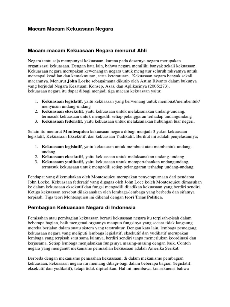 Teori kekuasaan negara tersebut dikemukakan oleh john locke dan montesquieu. Berikut masing masing penjelasan dari tiga konsep pembagian kekuasaan menurut montesquieu. Trias politika menurut montesquieu adalah sebuah teori yang menerapkan pembagian kekuasaan pemerintahan negara menjadi tiga jenis kekuasaan yaitu kekuasaan eksekutif kekuasaan legislatif dan kekuasaan yudikatif. Trias politica merupakan sebuah prinsip normative mengenai kekuasaan yang sebaiknya tidak diberikan kepada orang yang sama.
