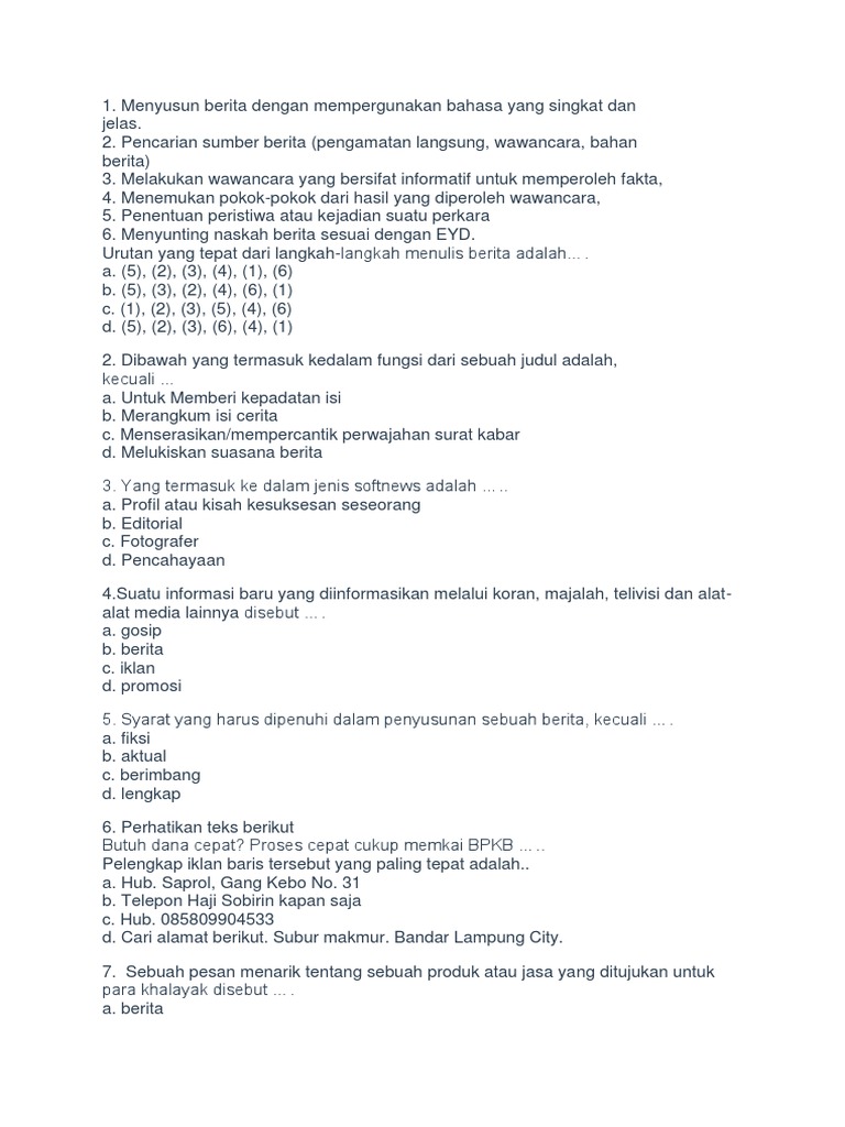 Syarat yang harus dipenuhi dalam penyusunan sebuah berita kecuali fiksi aktual berimbang lengkap. Keterangan yang diperoleh harus berimbang dengan cara dikonfirmasikan kepada pihak lain yang juga terlibat atau ahli. Pelengkap iklan baris tersebut yang paling tepat adalah. Berita disusun berdasarkan fakta fakta yang ditemui di lapangan. Teks menjelaskan sebuah informasi berdasarkan.