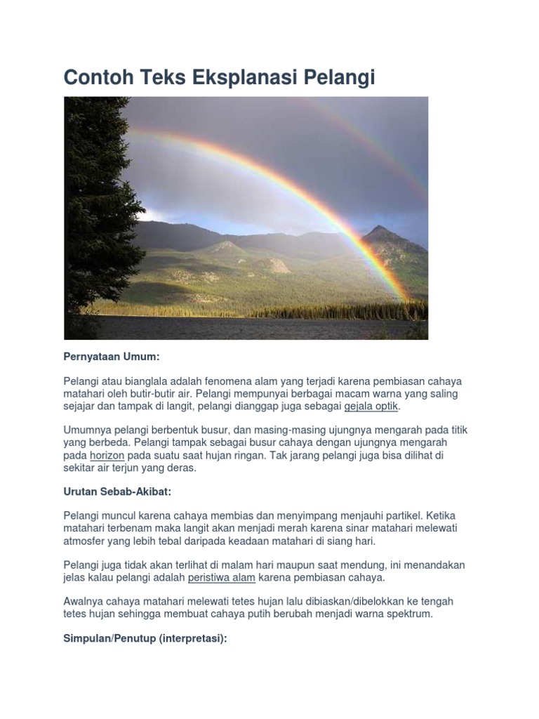 Contoh teks eksplanasi pelangi jika kalian terburu buru berikut contoh teks eksplanasi pelangi beserta strukturnya yang bersumber dari ilmu pengetahuan populer untuk anak 2007 karya hotimah dan m hariwijaya. 10 contoh teks eksplanasi sosial. Contoh teks eksplanasi tsunami pelangi juga sering dianggap sebagai gejala optik. 11 contoh teks eksplanasi kompleks.