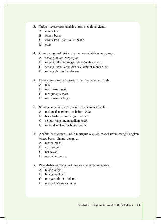 Adapun sarana yang dapat digunakan untuk thaharah yakni air debu dan batu. Sedangkan secara istilah wudhu adalah menggunakan air untuk dibasuhkan dan diusapkan bagian tubuh tertentu yang disertai dengan niat untuk menghilangkan hadas kecil. Keempat menghilangkan hadas tidak perlu membeda bedakan dan tartib. Najis 1 lihat jawaban mamanosz mamanosz kelas vii bhs arab tayamum saya bantu jawab ya dek.
