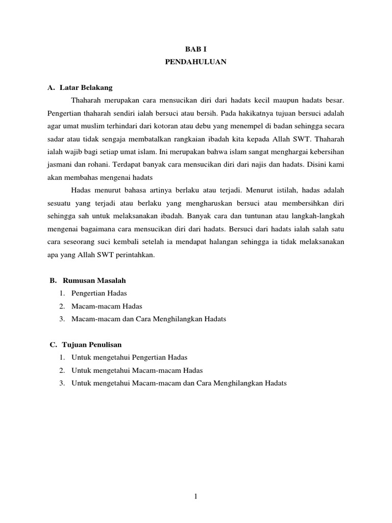 Pembahasan seputar penyebab hadats kecil dan hadas besar di mana suci dari keduanya menjadi syarat sahnya shalat selain suci dari najis. Di dalam berwudhu ada beberapa hal yang harus kita perhatikan yakni fardhu dalam wudhu sunnah dalam wudhu dan hal hal yang membatalkan wudhu. Macam macam hadas besar diantaranya bersetubuh keluar mani. Tata cara thaharah dari hadas meliputi mandi wajib wudhu dan tayamun.