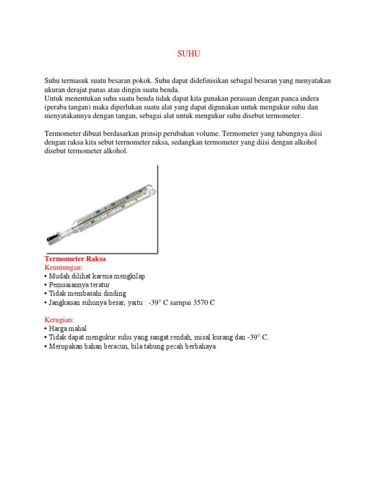 Dalam bidang termodinamik suhu merupakan suatu ukuran kecenderungan bentuk atau sistem untuk melepaskan tenaga secara spontan. Menurut kamus besar bahasa indonesia kbbi suhu adalah ukuran kuantitatif terhadap temperatur panas dan dingin diukur dengan termometer. Benda yang panas memiliki suhu yang tinggi sedangkan benda yang dingin memiliki suhu yang rendah. Ukuran derajat panas pada suatu benda dinamakan suhu.
