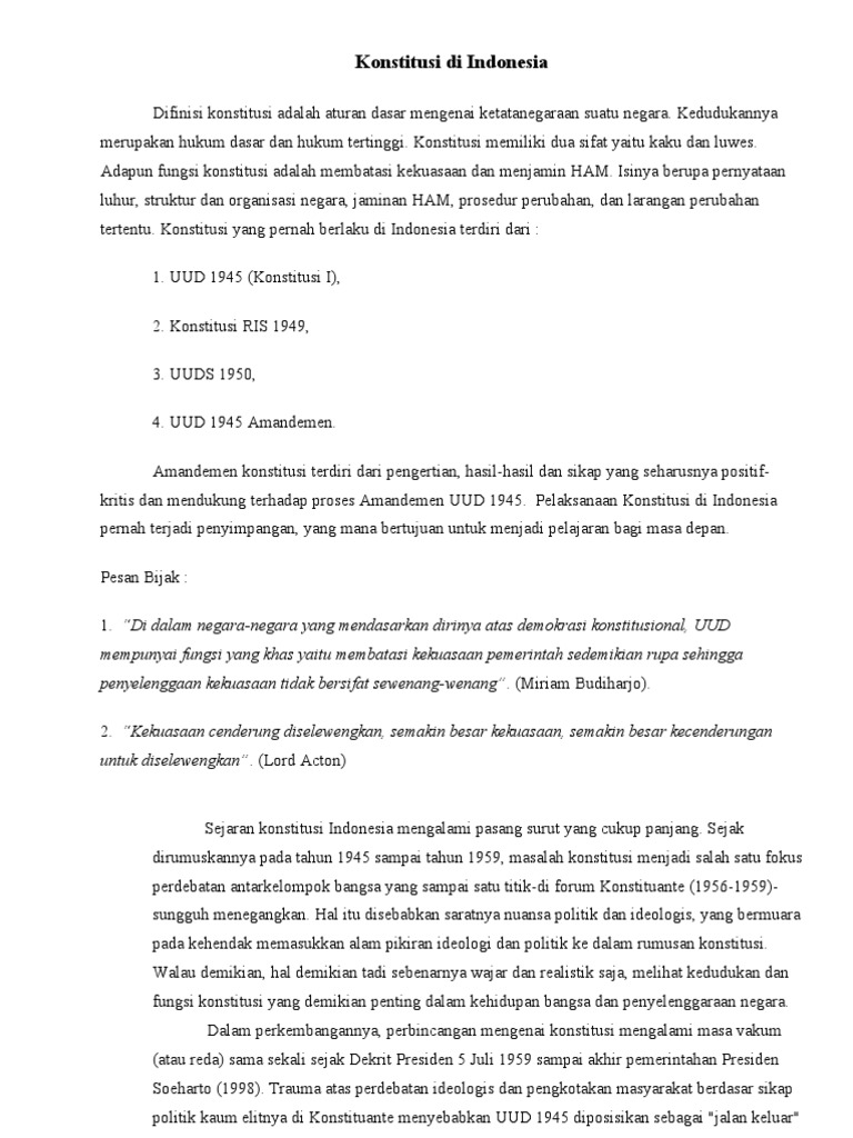 Konstitusi suatu negara dapat berdiri kokoh dengan adanya dukungan dari undang undang dasar atau konstitusi yang membuat negara tersebut menjadi suatu negara yang dapat mewujudkan visi dan misi negara dengan baik. Menurut l j apeldoornm undang undang dasar uud merupakan hukum dasar yang tertulis saja sedangkan konstitusi mencakup hukum dasar yang tertulis dan tidak tertulis. Konstitusi juga bertugas untuk menjamin hak hak asasi warga negaranya. Undang undang dasar negara republik indonesia tahun 1945 pembukaan p r e a m b u l e.