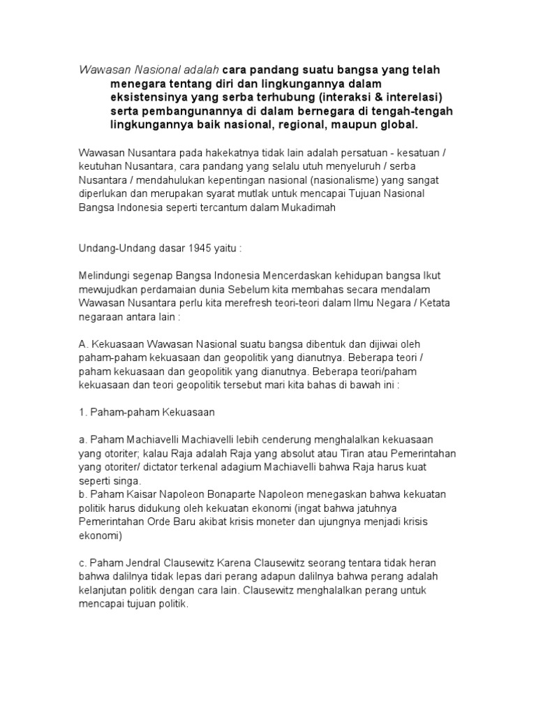 Wawasan tersebut dibentuk dan dijiwai oleh paham kekuasaan bangsa indonesia dan geopolitik indonesia. Wawasan nasional suatu bangsa dibentuk dan dijiwai oleh paham kekuasaan dan geopolitik yang dianutnya. Paham machiavelli machiavelli lebih cenderung menghalalkan kekuasaan yang. Nusantara adalah sebuah kata majemuk yang diambil dari bahasa jawa kuno yakni nusa yang berarti pulau dan antara artinya lain.